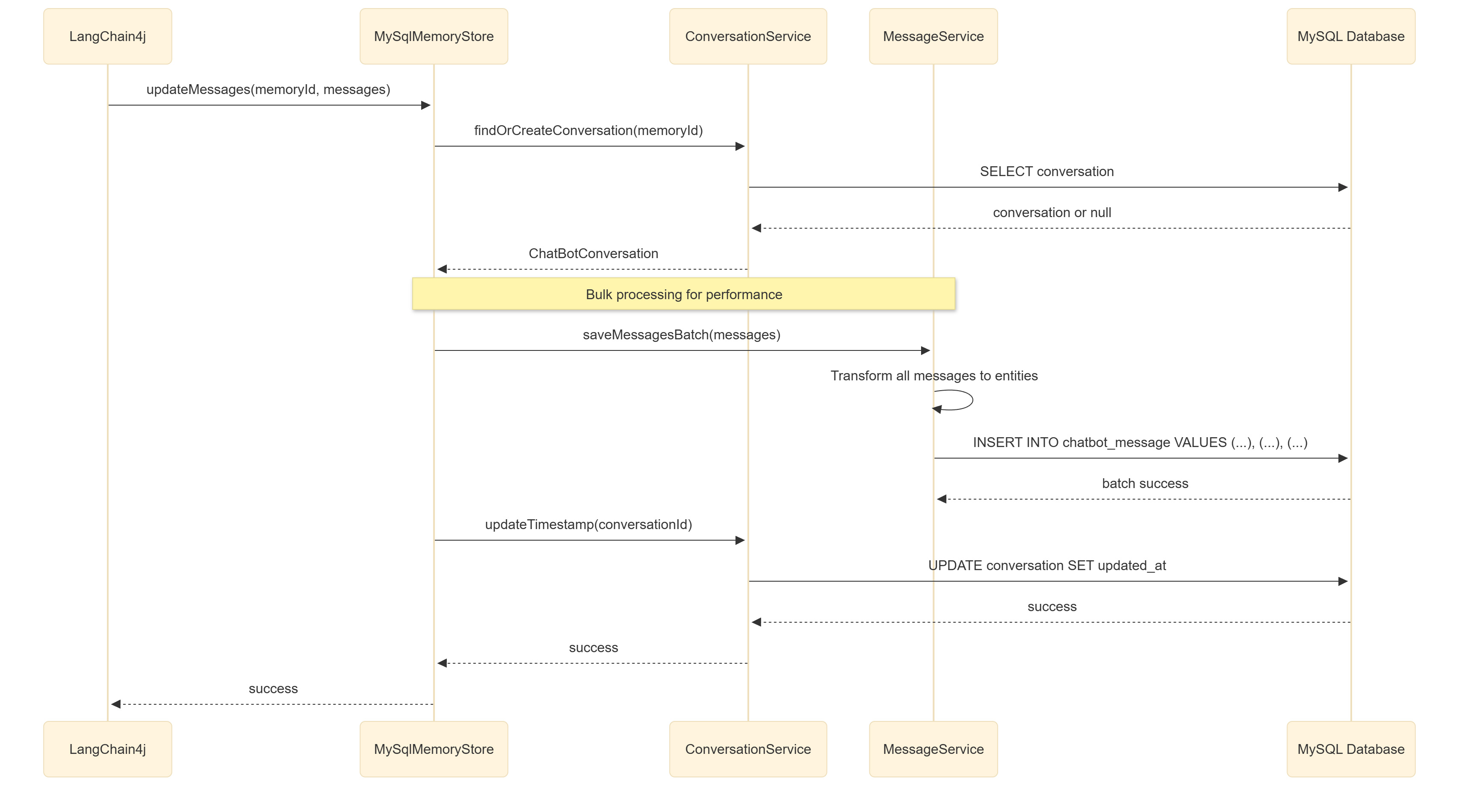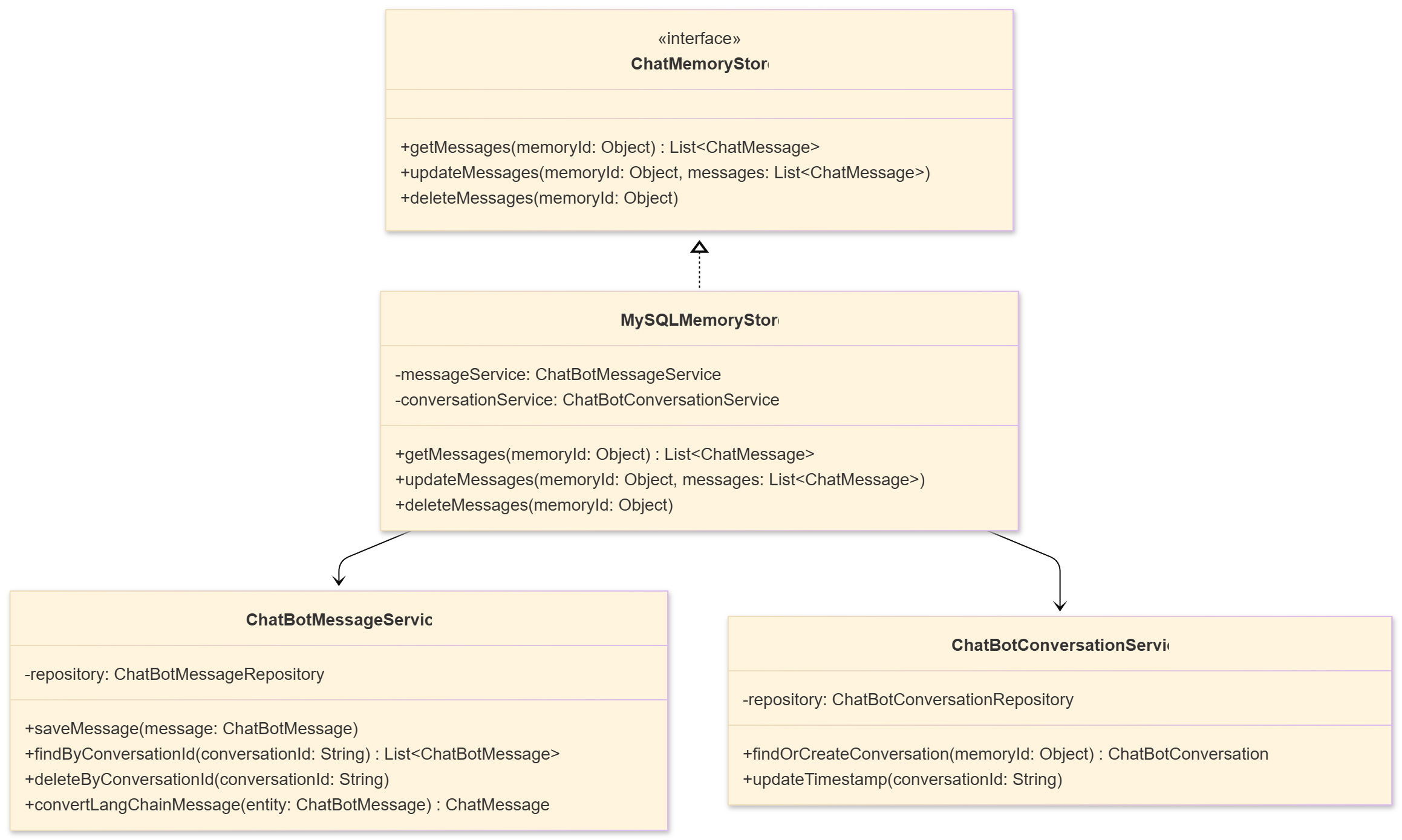 The MySQLMemoryStore class serves as the primary interface, implementing LangChain4j's ChatMemoryStore contract. This layer handles the translation between LangChain4j's message objects and our database entities.