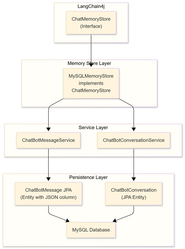 Our MySQL-based memory store implements the ChatMemoryStore interface from LangChain4j, creating a bridge between the framework's in-memory abstractions and persistent database storage. The architecture consists of three primary layers: